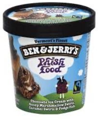 Phish Food is a popular flavor of Ben Jerrys ice cream. Let me say that I dont generally eat ice cream. Its vanilla ice cream with chocolate swirls and caramel ribbons topped with marshmallow swirls.